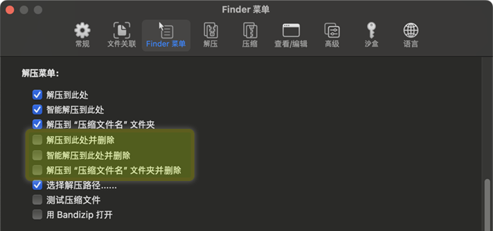 To minimize such risks, Bandizip keeps the Extract and Delete feature disabled by default. To access the feature, go to Preferences > Finder Menu tab and check the checkbox(es) as shown in the screenshot below.